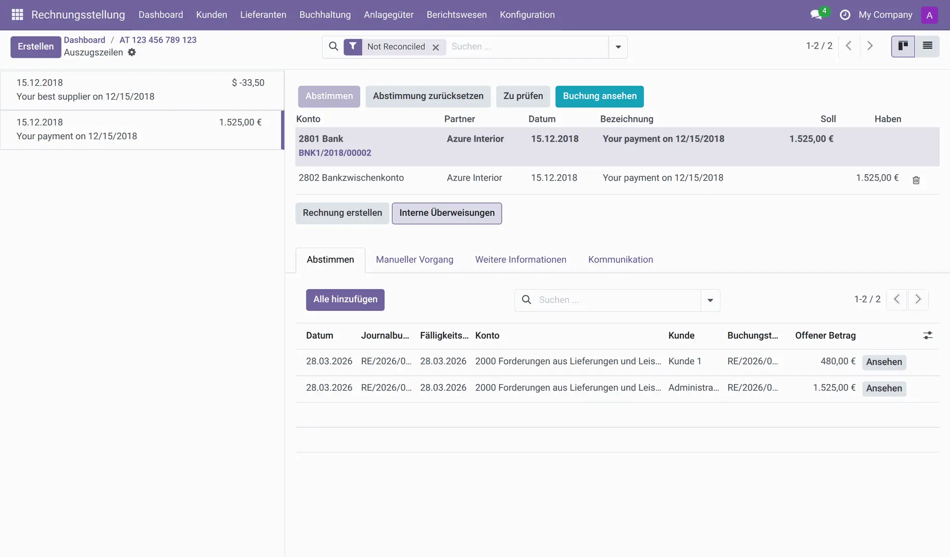 - Odoo erstellt automatisch die entsprechenden Bankzeilen, die dann abgestimmt werden können. Bevor Transaktionen abgestimmt sind, werden sie immer auf das Bankzwischenkonto gebucht.