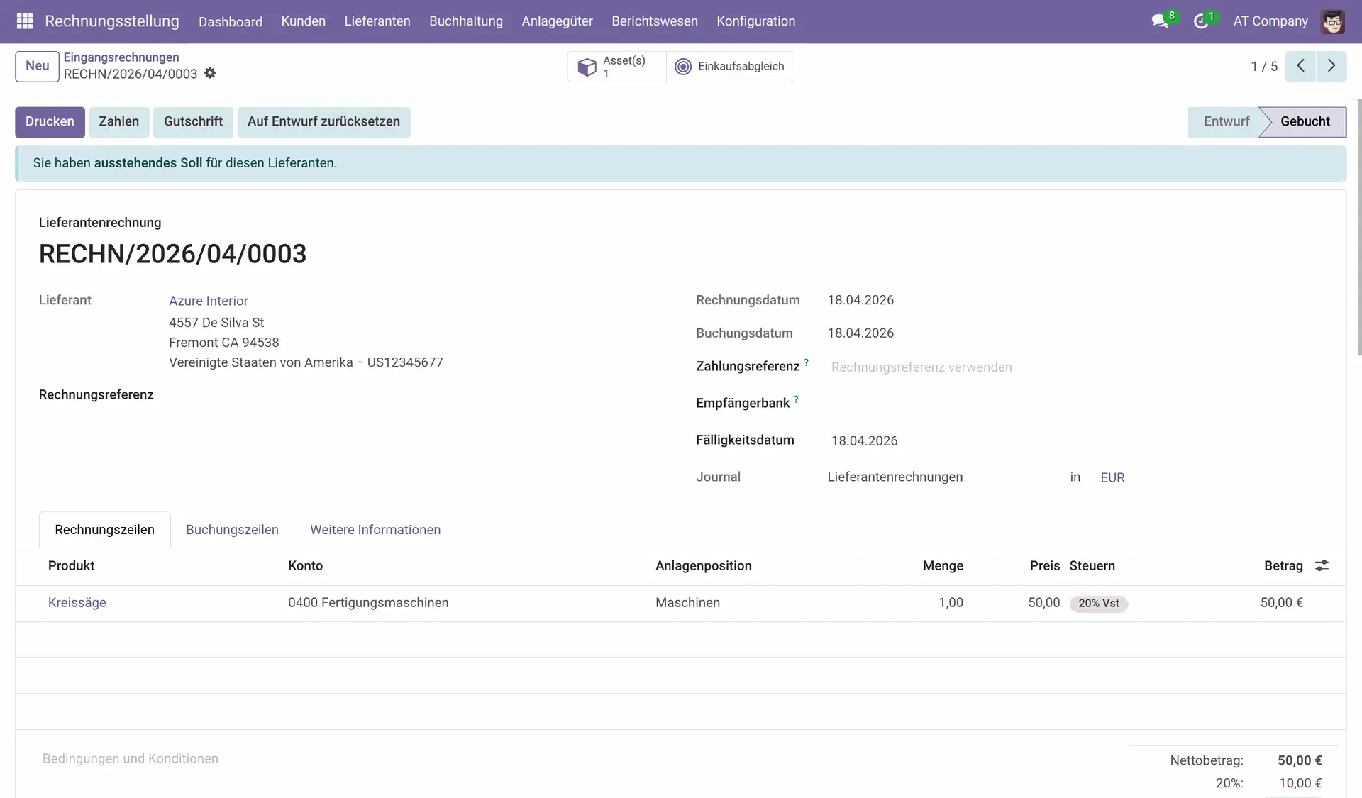 Nun können Anlagen erstellt werden. Bestehende Anlagen können unter Anlagegüter > Anlagegüter erstellt werden. Für neue Anlagegüter ist es am sinnvollsten, diese direkt bei der Erstellung der Lieferantenrechnung anzulegen. Dazu muss bei der Rechnungsposition einfach eine Anlagenposition hinterlegt werden. Dadurch wird automatisch das richtige Konto hinterlegt. Wenn die Rechnung bestätigt wird, wird automatisch die Anlage erstellt.