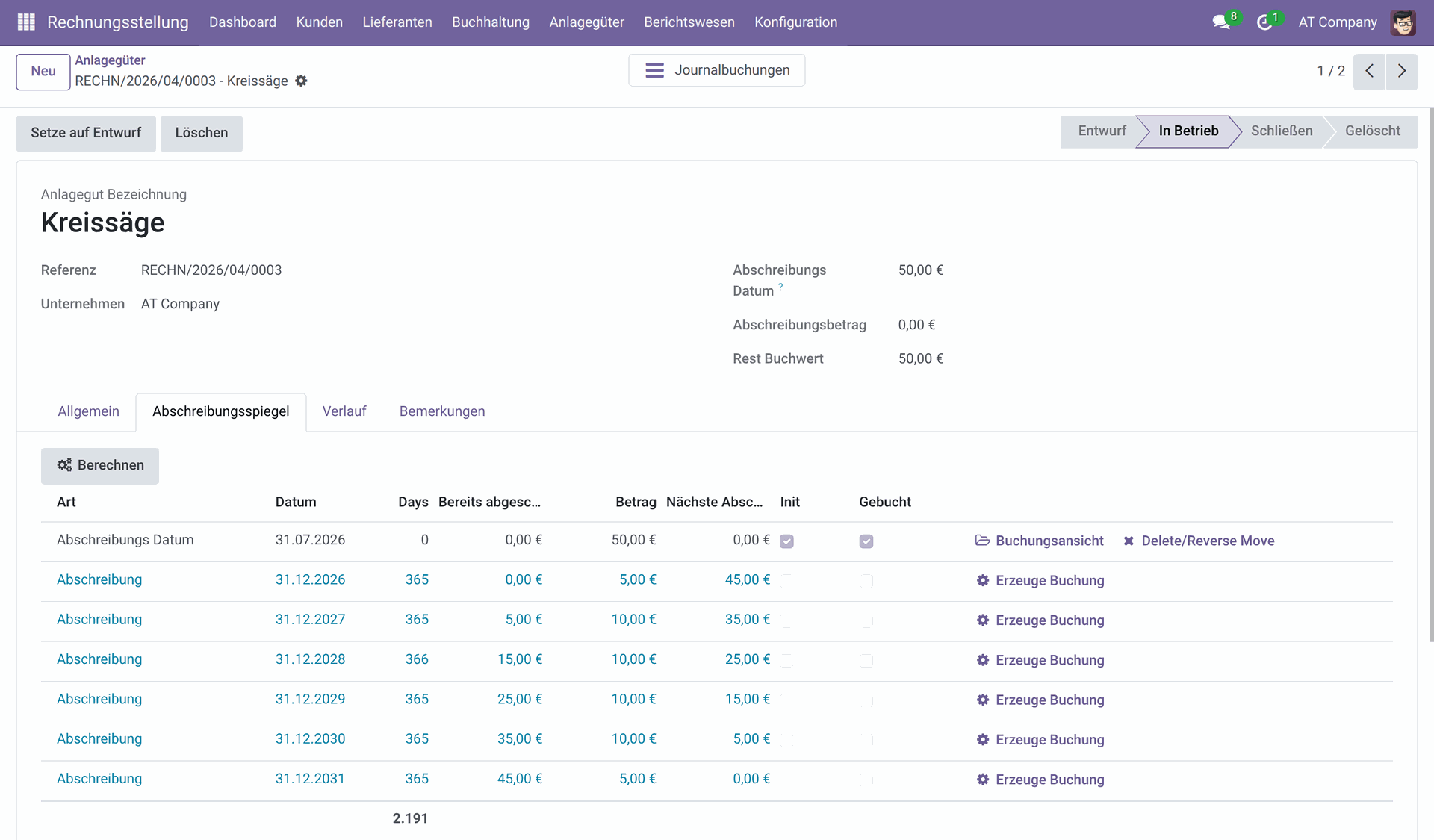 Die erstellte Anlage kann nun über den Smartbutton in der Eingangsrechnung geöffnet werden. Im Abscheibungsspiegel kann der Abschreibungsplan eingesehen werden. Wenn dieser korrekt ist, kann die Anlage bestätigt werden.